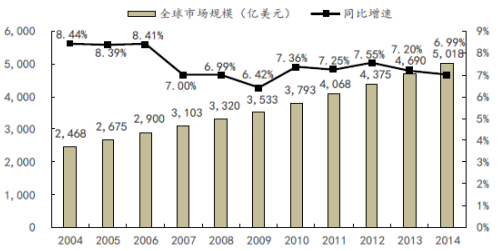 随着经济的发展、人口的增长、社会老龄化程度的提高,以及人们保健意识的不断增强,全球医疗器械市场需求持续快速增长,医疗器械行业是当今世界发展最快的行业之一。据欧盟医疗器械委员会的统计数字,全球医疗器械市场销售总额已从 2004 年的2,468 亿美元迅速上升至 2014 年的 5,018 亿美元,年复合增长率达 7.35%,全球医疗器械市场增长率超过同期 GDP 增幅,前者约为后者的 2 倍。